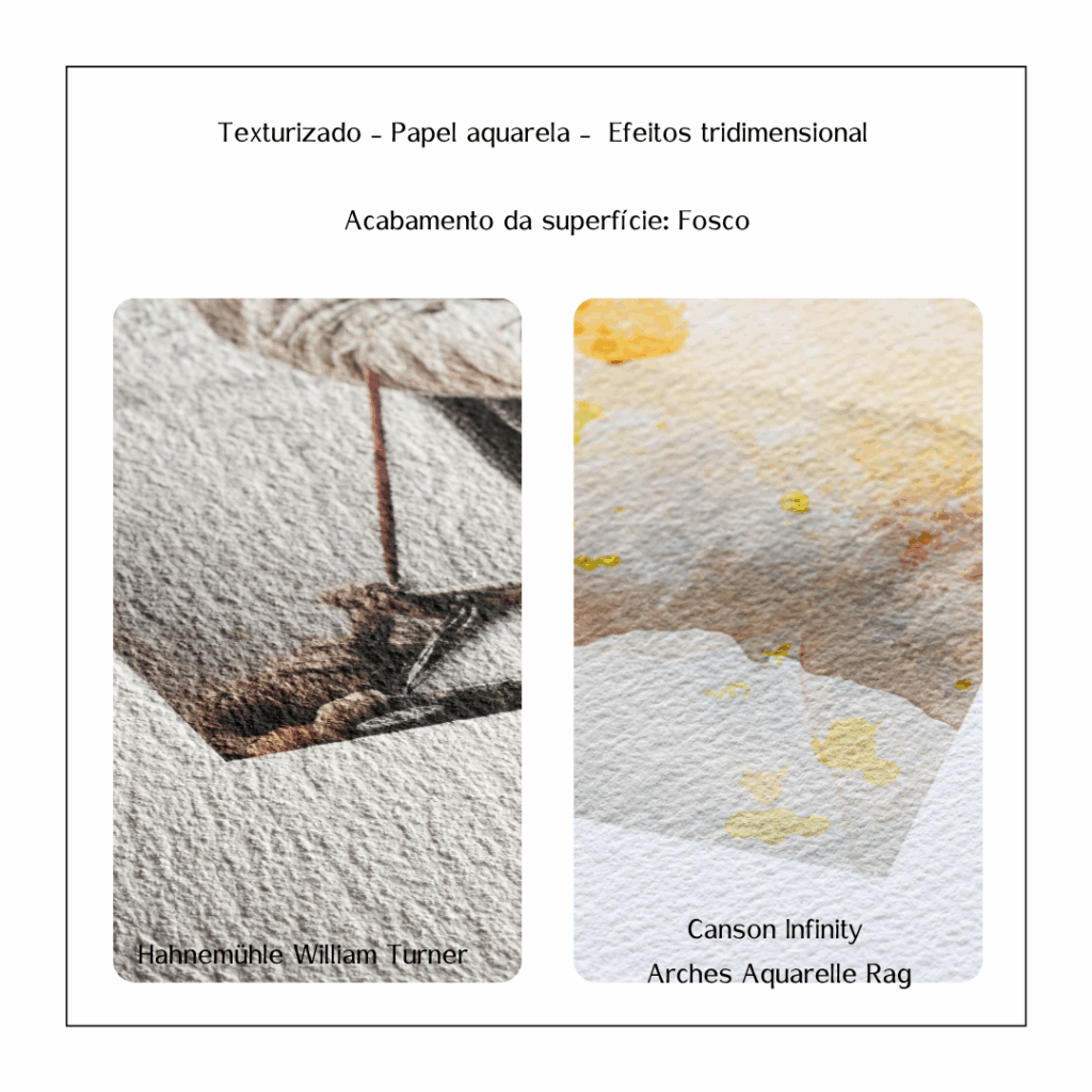Papéis texturizados – Ideais para obras artísticas que desejam uma textura mais aparente. O resultado é uma impressão mais “física” da imagem, como uma pintura.