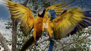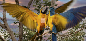A arara-canindé (Ara ararauna) é uma das aves mais icônicas do Brasil! Também conhecida como arara-de-barriga-amarela, ela se destaca por suas cores vibrantes: azul no dorso e amarelo na parte inferior. Seu bico é forte e curvado, perfeito para quebrar sementes duras.
